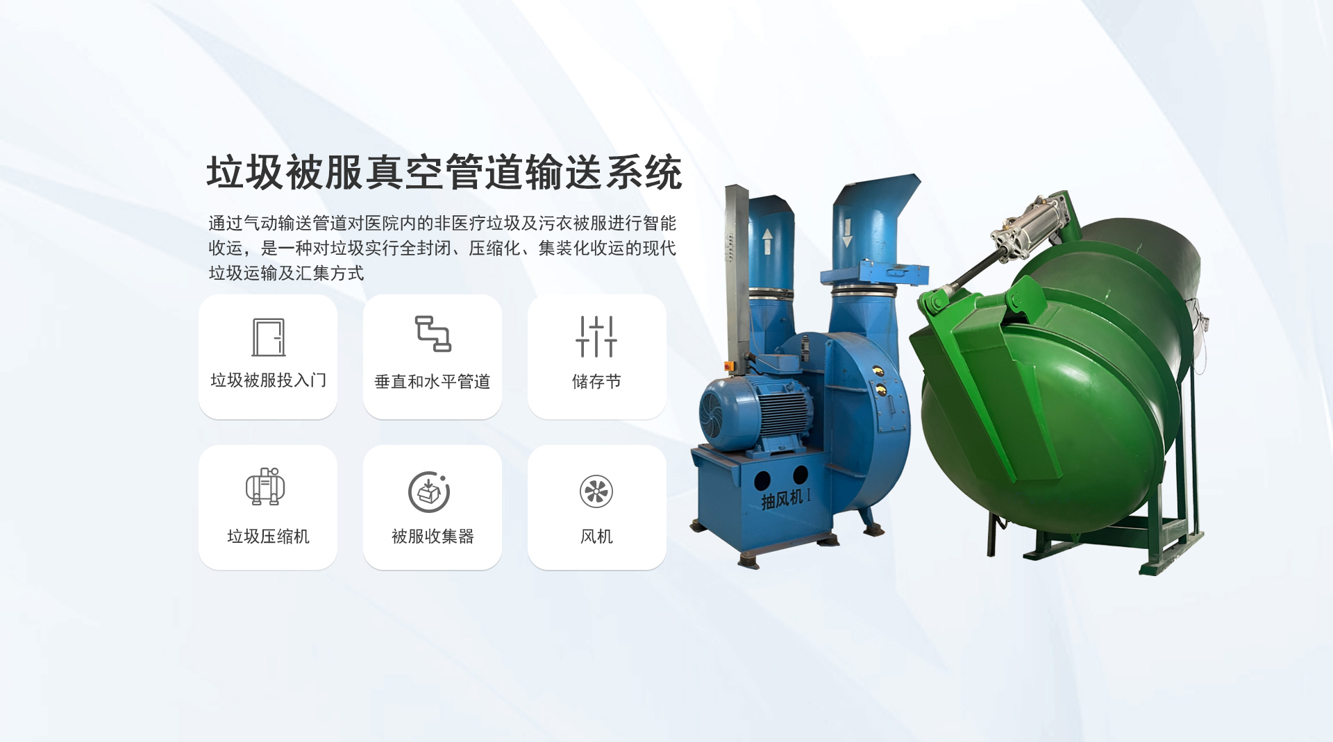 系統(tǒng)簡介:通過氣力式輸送管道對醫(yī)院內(nèi)的垃圾和污衣被服進行收集,是一種對垃圾實行全封閉、壓縮化、集裝化收運的現(xiàn)代垃圾運輸及匯集方式...